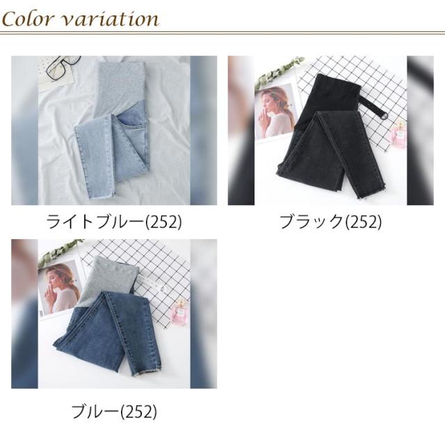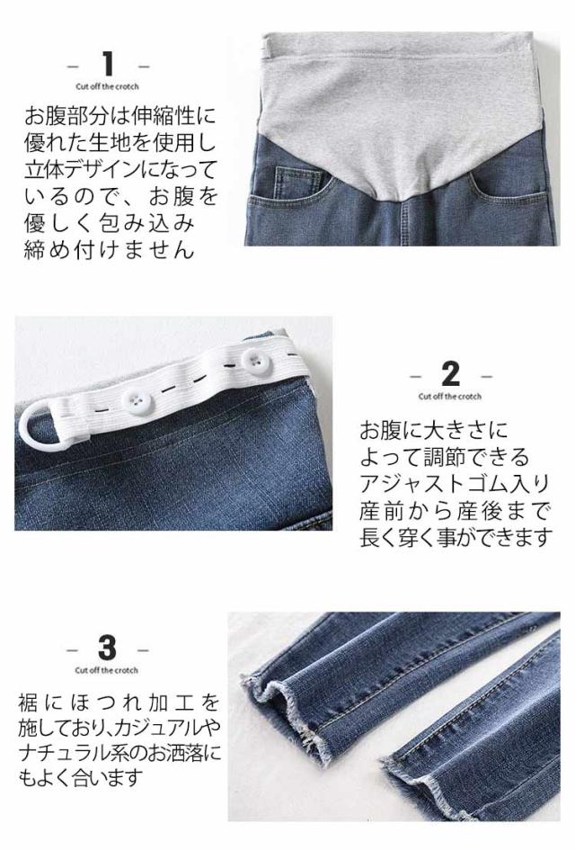 | カジュアルお洒落をたのしめる裾にほつれ加工を施したお洒落なデニムパンツ。 毎日のコーデとも合わせやすく1枚持っているととっても便利なアイテムです。 伸縮性のあるデニム素材を使用、動きやすくフィット感も抜群、美脚効果も◎ ウエストにはアジャスト機能付き、妊娠初期から産後まで履けるデザインです。 お腹周りもお腹の大きさに合わせて、伸縮できるような素材を使用、お腹周りにフィットしお腹を優しくサポートします。 | |