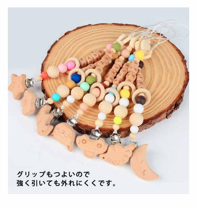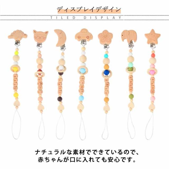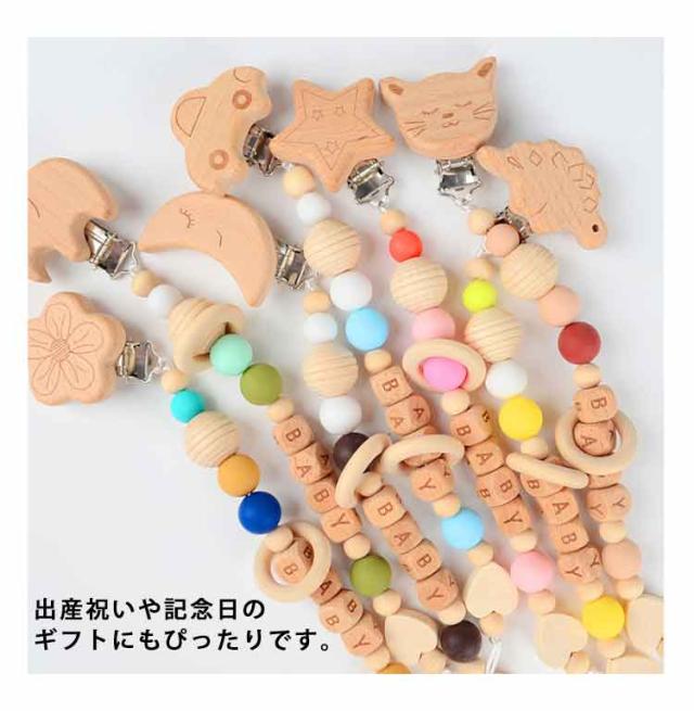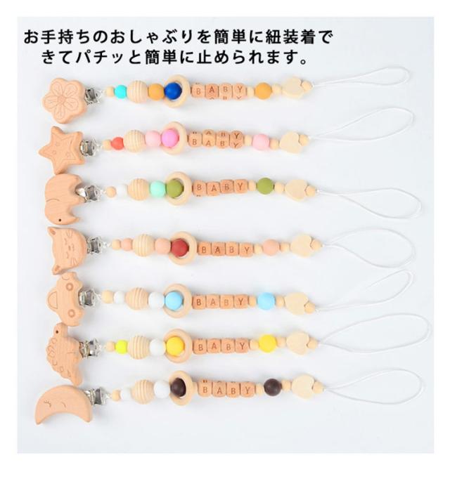 | 動物たちや月、花、星モチーフのクリップが付いたかわいいおしゃぶりホルダーです。 ナチュラルな素材でできているので、赤ちゃんが口に入れても安心です。 お手持ちのおしゃぶりを簡単に紐装着できてパチッと簡単に止められます。 グリップもつよいので強く引いても外れにくくです。 出産祝いや記念日のギフトにもぴったりです。 | |