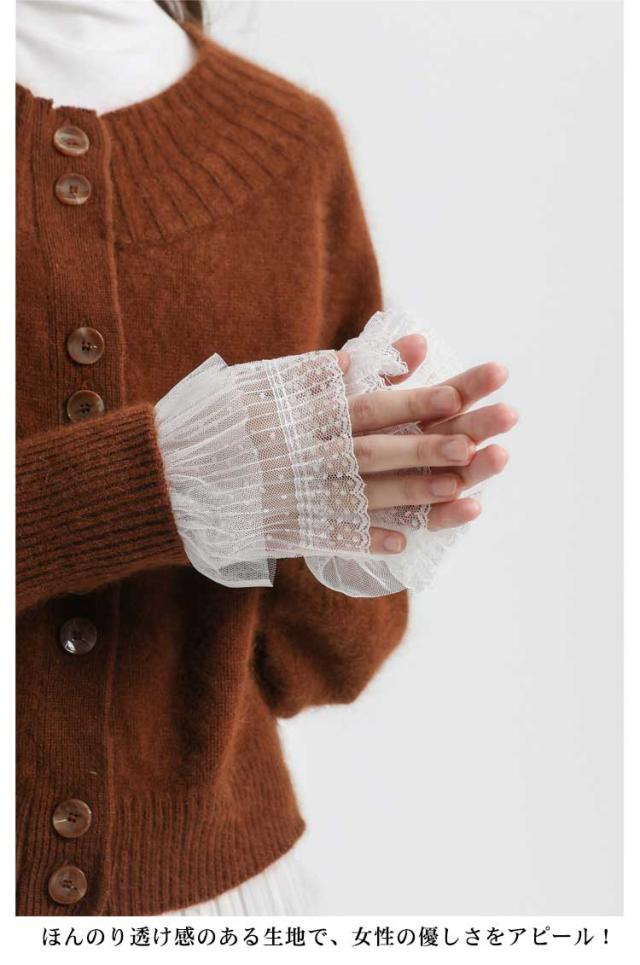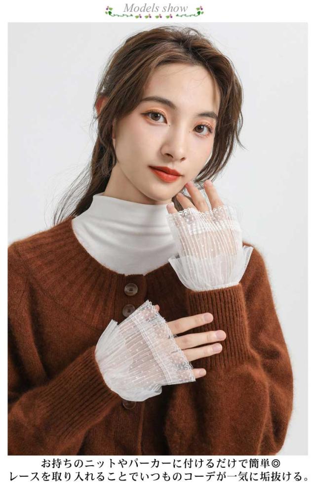 | 袖口のオシャレを楽しもう!袖口は可愛い!コーディネートの幅を広めろう◎ 長袖のカットソーやニット、ワンピース等に合わせることで、手軽に重ね着を楽しめ、コーディネートのアクセントにも! 手首部分は着脱しやすゴムタイプ。 絶妙な透かしレースで上品感を醸し出してくれます☆ レイヤード感を簡単に作り出し、ファッションを思い存分遊べるアイテムです。 | |