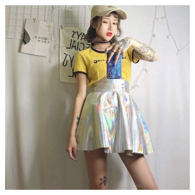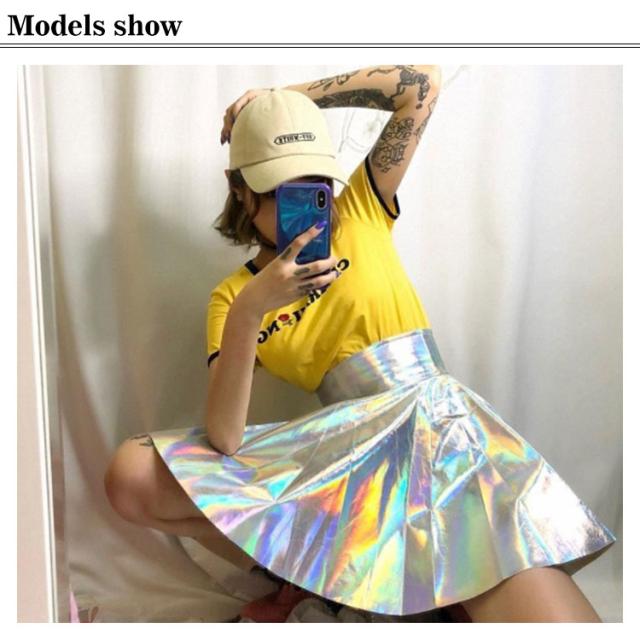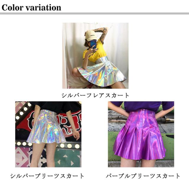フレアスカート プリーツスカート ミニスカート ハイウエスト オーロラカラー オシャレ 奇抜 派手 個性的 ダンス 衣装 コスチューム ヒップホップ HIPHOP シルバー キラキラ ショート丈 ミニスカ レディース ガールズ キッズ