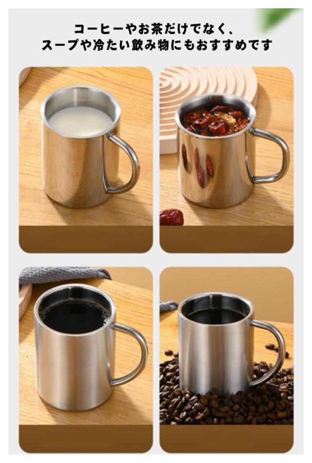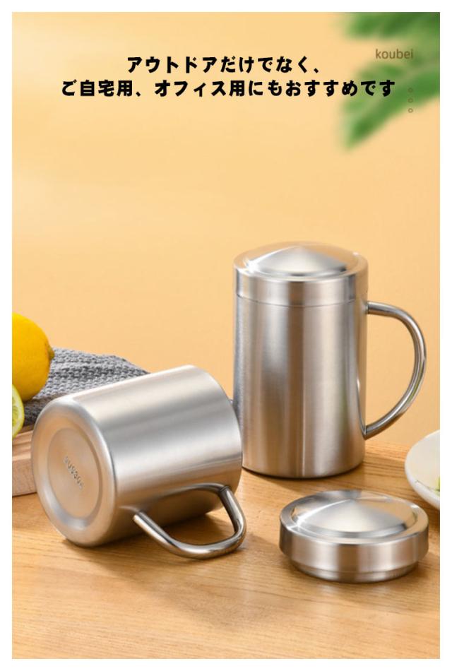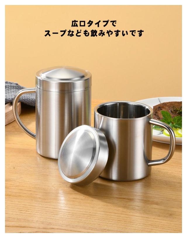 | 真空二重構造で保温・保冷可能なステンレスマグカップ。 フタ付きなので保温保冷効果もあり、ほこりが入るのも防ぎ衛生的です。 アウトドアだけでなく、ご自宅用、オフィス用にもおすすめです。 ステンレス真空断熱構造で、熱伝導を抑え保温保冷をキープします。 コーヒーやお茶だけでなく、スープや冷たい飲み物にもおすすめです。 広口タイプでスープなども飲みやすいです。 | |