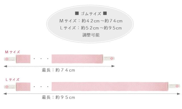 幅広のゴムを使い体に一周させることによりしっかりと留まるので、強く締める必要がなく着装が安定し、乱れにくいです。