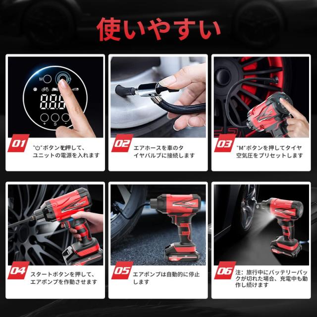 ワンキープリセット 5種類の空気入れモード:バスケットボール、自転車、オートバイ、車、SUVが設定されています。たったの3ステップで使い方簡単:電源オン、空気入れモードを選択、空気入れを開始。空気圧がプリセット値に達すると自動で空気の注入が終わるので、空気の入れすぎを防ぎます。