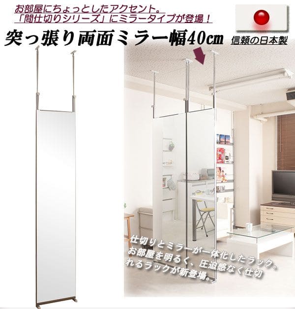 パーテーション 鏡 ミラー 突っ張り 姿見 全身 ラック リビング 40 薄型 コンパクト 日本製 つっぱり アイアン 天井 枠なし おしゃれ 垂直 ノンフレーム
