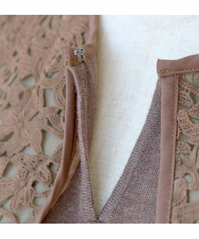 ウエストでシェイプされたシルエットで、スカートはマーメイドラインの動きがあるデザイン。目を引くレース柄のビックカラーがポイント。