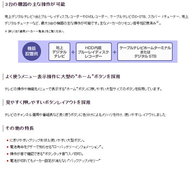 地上デジタルテレビ1台とブルーレイディスクレコーダーやDVDレコーダー、ケーブルテレビのD-STB、スカパー!チューナー、地上デジタルチューナーなど、最大3台の機器の主な操作が可能です。主なメーカーのリモコン信号を記憶済み※。