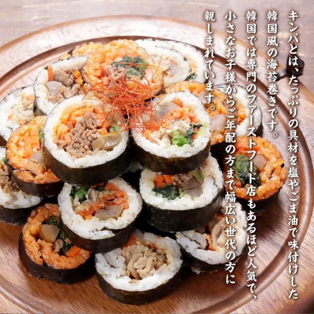 キンパとはたっぷりの具材を塩やごま油で味付けした韓国風の海苔巻きです。 韓国では専門のファーストフード店もあるほど人気で、老若男女に幅広く親しまれています。