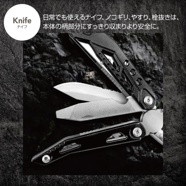 【ナイフ】日常でも使えるナイフ、ノコギリ、やすり、栓抜きは、本体の柄部分にすっきり収まり安全です。