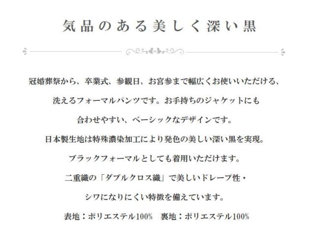冠婚葬祭から、卒業式、参観日、お宮参まで幅広くお使いいただける、洗えるフォーマルパンツです。