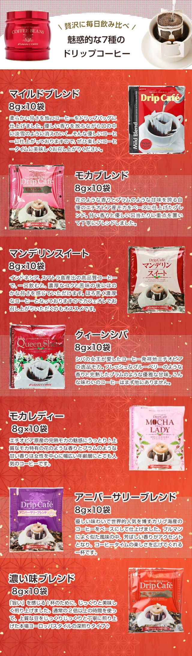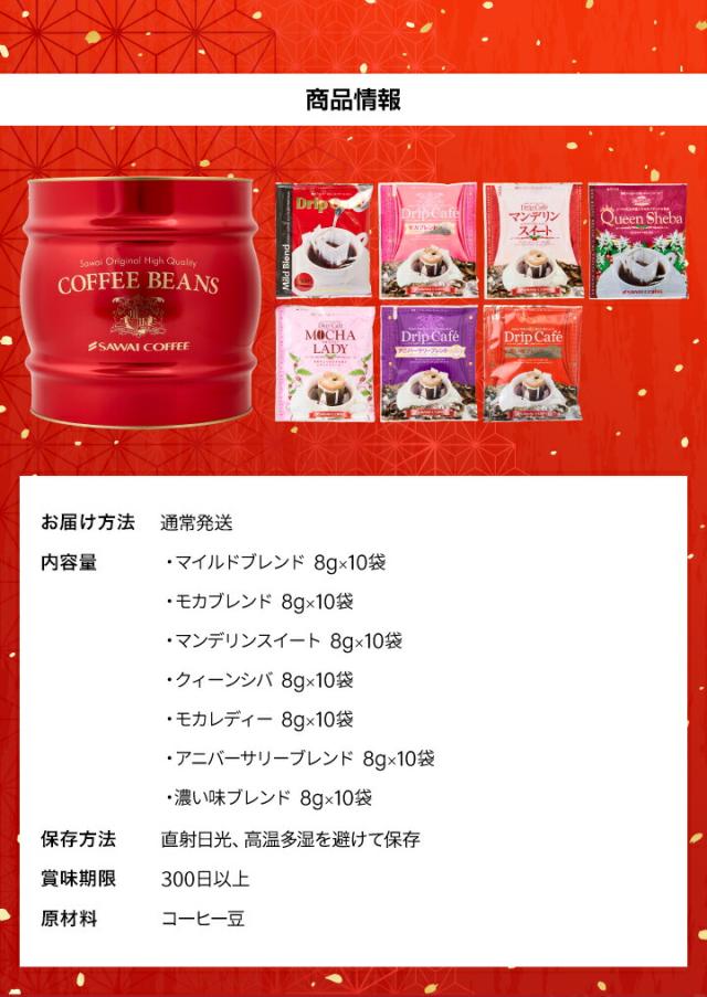 | 内容量 | ●ドリップバッグコーヒー ・マイルドブレンド 8g×10袋 ・モカブレンド 8g×10袋 ・マンデリンスイート 8g×10袋 ・クイーンシバ 8g×10袋 ・モカレディー 8g×10袋 ・アニバーサリーブレンド 8g×10袋 ・濃い味ブレンド 8g×10袋 |