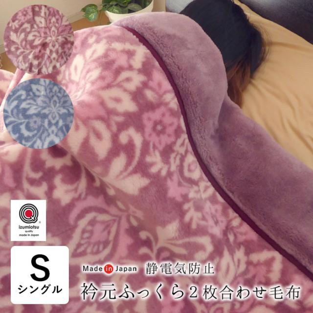 毛布 シングル 2枚合わせ マイヤー毛布 厚手 軽量 衿付き毛布 かさ高 静電気防止 日本製 泉大津 ロマンス小杉 あったか 花柄 8530-3100