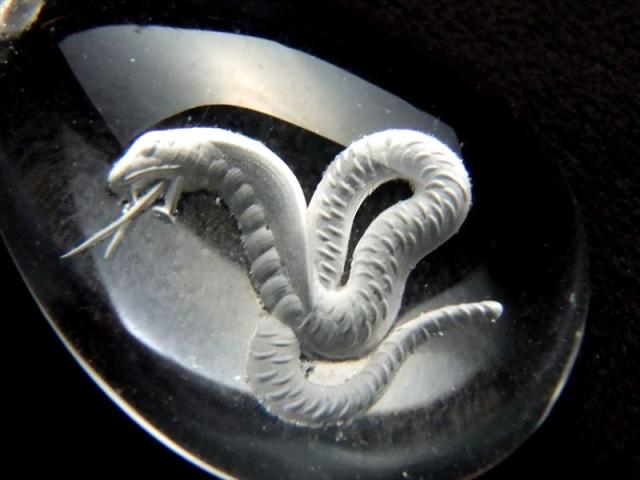 白ヘビ彫り天然水晶・ペンダントトップ 天然水晶のドロップ型タンブルの裏側から立体的に彫刻が施された手彫りペンダントです。 透明度抜群の水晶に白蛇が舌を出した姿が彫られており、迫力十分のお勧め品です 蛇(白蛇)は神の使いと云われ、金運などのお守りとしても象徴されています。 その意味合いと神秘的な姿から大変人気があります 。 すべてを清める浄化の云われのある水晶に白蛇が合わさり、空間浄化はもちろんのこと、開運・お守りとしても良しです。 ストーンキーワード 全てを清め浄化する。 潜在的な能力やパワーを高める。 |