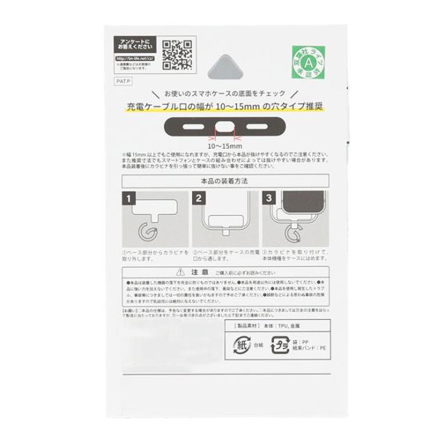 | 注意点 | ※充電ケーブル口の幅が10〜15mmの穴タイプ推奨。 ※幅15mm以上でもご使用になれますが、充電口から本体が抜けやすくなるのでご注意ください。 ※また推奨寸法でもスマートフォンとケースの組み合わせによっては抜けやすい場合があります。 ※本体装着後にカラビナを引っ張って簡単に抜けないことをご確認ください。 ※本品は装着した機器の落下を完全に防ぐものではありません。 ※誤飲などによる思わぬ事故の危険がありますので乳幼児には絶対与えないでください。 ※お取り扱いの際は、商品やパッケージなどに記載されている品質表示、アテンションタグ、ご使用上の注意事項などを必ずご確認下さい。 ※本来の目的以外にはご使用にならないで下さい。 ※カメラやモニターの性質により、画像と実物の色の違いがある場合がございますのでご理解願います。 |