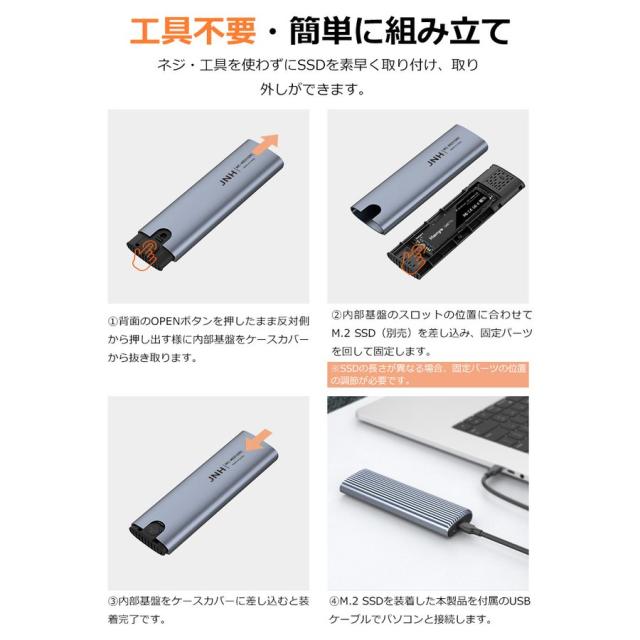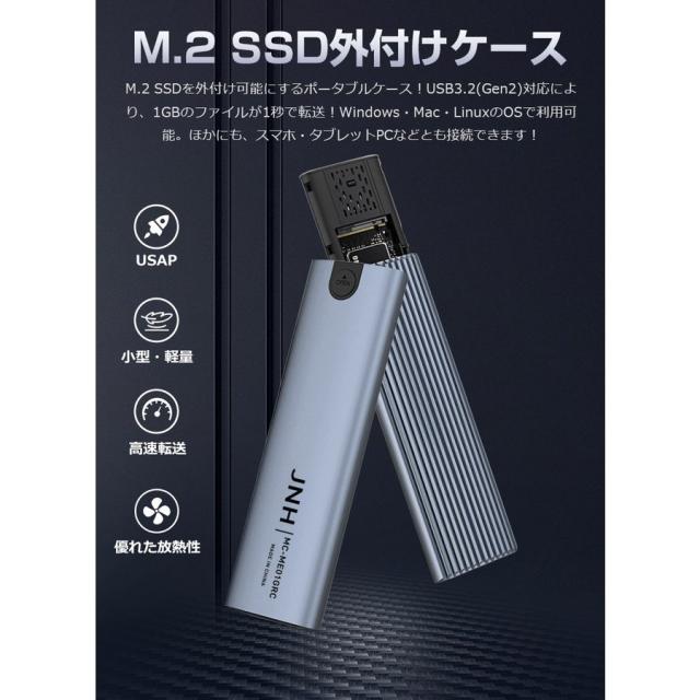 JNH製 M.2 SSD外付けケース M-Key対応 NVMe M.2 SSDケース 工具不要 USB3.2 Gen2 Type-C UASPサポート 2230/2242/2260/2280 SSD対応 ネコポス送料無料 ポイント消化