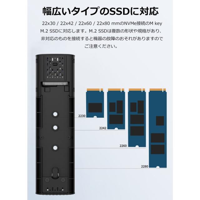 【幅広いタイプのSSDに対応】NVMe接続のM key M.2 SSDに対応し、22mm幅の4つのサイズ (2230 / 2242 / 2260 / 2280) のSSDが接続可能。また、Windows・Mac・Linuxなどの複数のシステムと互換性があります。