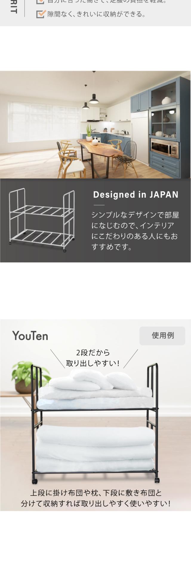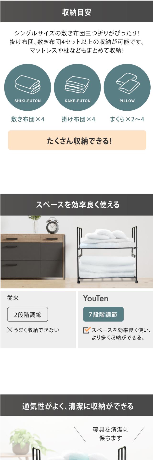 - 布団用のラックがあってとても助かります。しっかりした作りですがそれ程重くないです。簡単に組み立てられます。