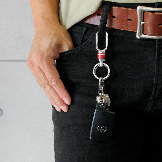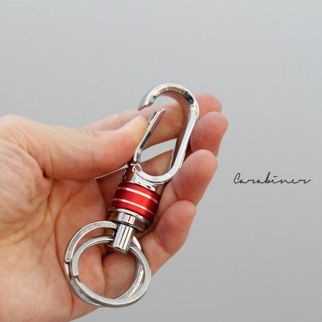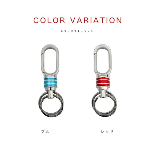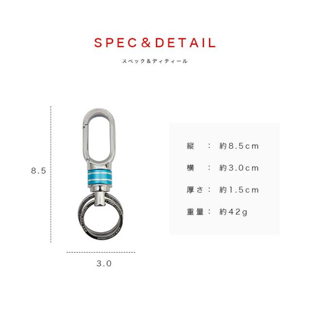 シンプルなデザインのカラビナキーホルダーです。本体中央のブルーとレッド飾りは回転式に遊び心があります。単体で使用するのはもちろんウォレットチェーンなどのレザーアイテムと組み合わせても使えます。