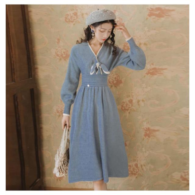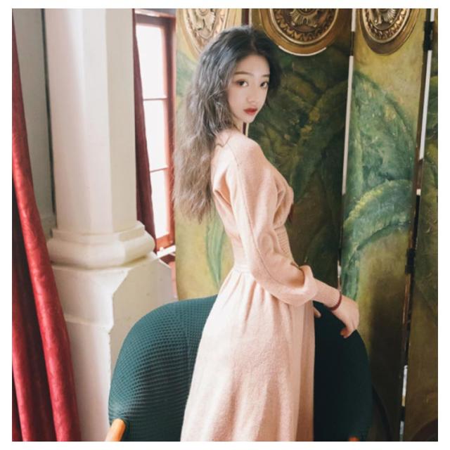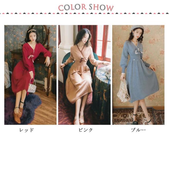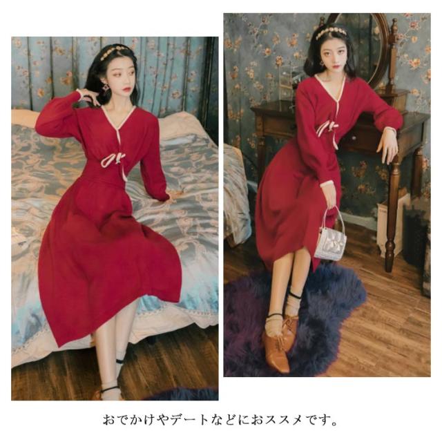 フレアワンピース ニットワンピース Aラインワンピース 膝丈 カシュクール 長袖 無地 かわいい レディース フェミニン エレガント 通勤 デート 可愛い 新作