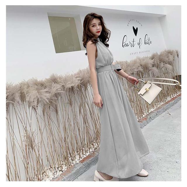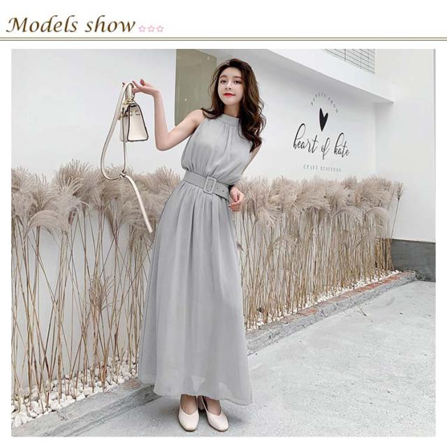 ハイネックマキシワンピース シフォンワンピース マキシ丈 ノースリーブワンピース ハイネック ワンピース 夏ワンピース ビーチワンピース マキシワンピ マキシ丈ワンピース 袖なし ふんわり ウエストベルト付き