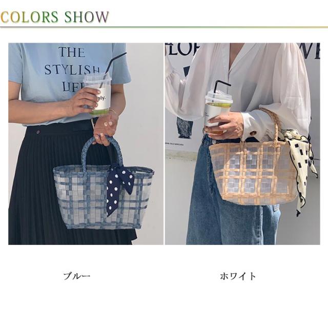 | 2色展開、今年トレンドなかわいいかごバッグ。 大きさもちょうど良いです。形はしっかりしていて出し入れも順調。 やや透明になる格子縞の素材が、かわいさのポイント。 おまけのスカーフがついています。スカーフをハンドルにつけるとおしゃれ感あふれ。 おでかけ、収納、なんでもおまかせ!旅行・お花見・お出かけの時におすすめアイテム。 | |