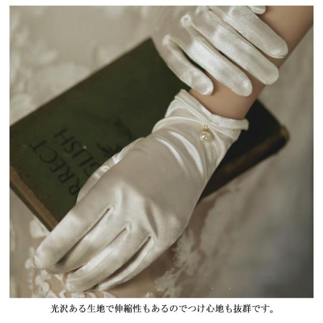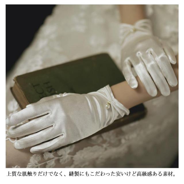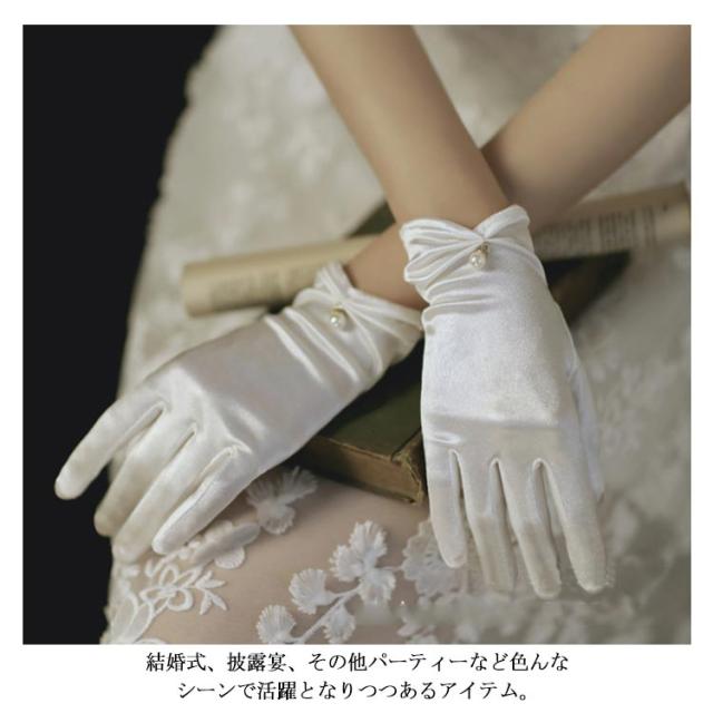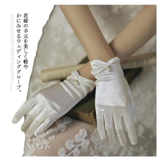 | 花嫁の手元を美しく軽やかにみせるウェディンググローブ。 結婚式、披露宴、その他パーティーなど色んなシーンで活躍となりつつあるアイテム。 光沢ある生地で伸縮性もあるのでつけ心地も抜群です。 上質な肌触りだけでなく、縫製にもこだわった安いけど高級感ある素材。 手首にパール付きギャザーデザインでより可愛っぽい。どんなドレスにも合わせやすい。 | |
