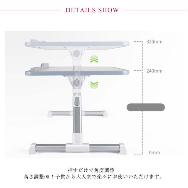 | ワンタッチで角度・高さ調整可能 ロータイプ折りたたみテーブル。 天板は0-36度角度調整可能で、パソコン作業や雑誌を見たり、映画鑑賞する時、楽々な体勢で楽しめるから、腰や背中、首への負担を軽減できます。 高さ調整OK!子供から大人まで楽々にお使いいただけます。 安心なストッパー付きで、天板を傾けた状態でもパソコンやタブレットが落下することなく安心◎ ノートパソコンを置いて在宅勤務やちょっとした書物、子供用食卓、カフェタイムなど色々なシーンで活躍。 軽量でコンパクトなので、持ち運び便利から、お家ではもちろん、キャンプやアウトドアなど様々な場所にてご使用いただけます。 使わない時はコンパクトに折りたためるから、収納スペースを取らず、とても便利。 | |