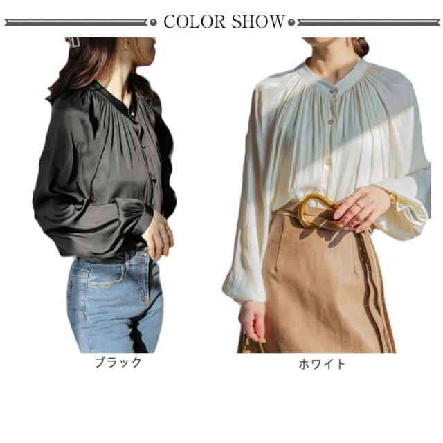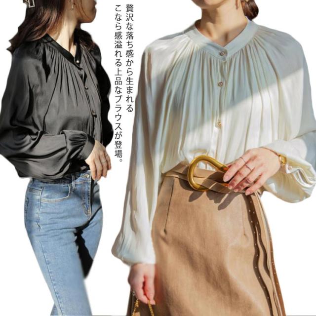 光沢感のあるブラウス シャツ トップス レディース 送料無料 バルーン袖 バンドカラー ミドル丈 長袖 ぽわん袖 ボリュームスリーブ ギャザー ストレッチ オフィスカジュアル きれいめ 大人 無地 オフィス 通勤