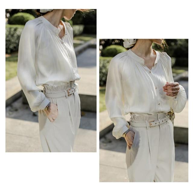 | 贅沢な落ち感から生まれるこなら感溢れる上品なブラウスが登場。 柔らかく軽い素材の生地のため、着心地が良い点も魅力的な上質なブラウスです。 ふんわりしたボリューム袖が二の腕をほっそりに見せてくれ、光沢感も可愛らしいです。 袖が特徴的ですがボリュームが大げさすぎず、オフィスに来ていってもいい、幅広いシーンで活躍する一枚。 前ボタンの仕様で、ベストやビスチェとのレイヤードコーデに抜け感をプラスします。 | |