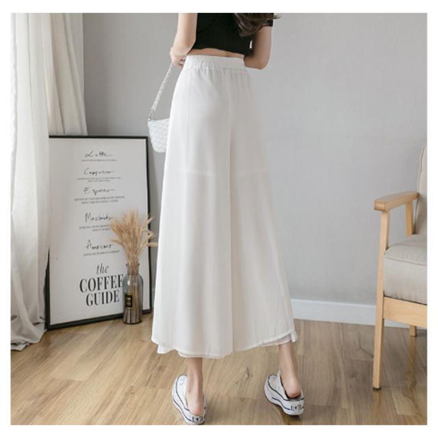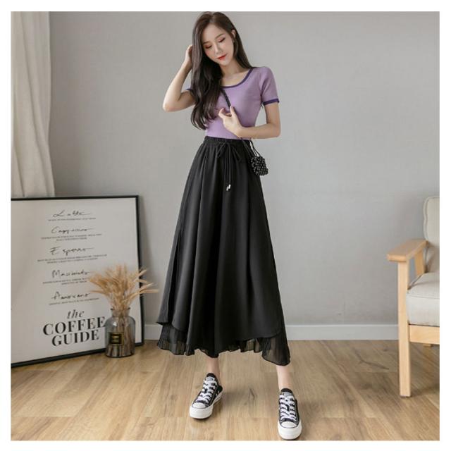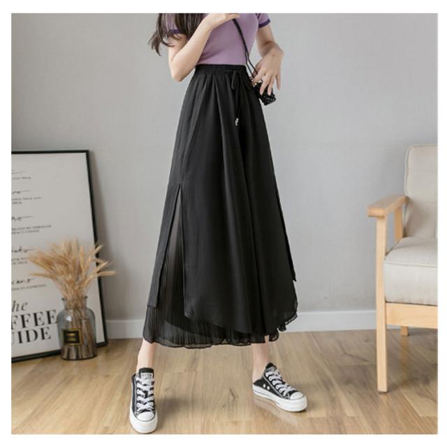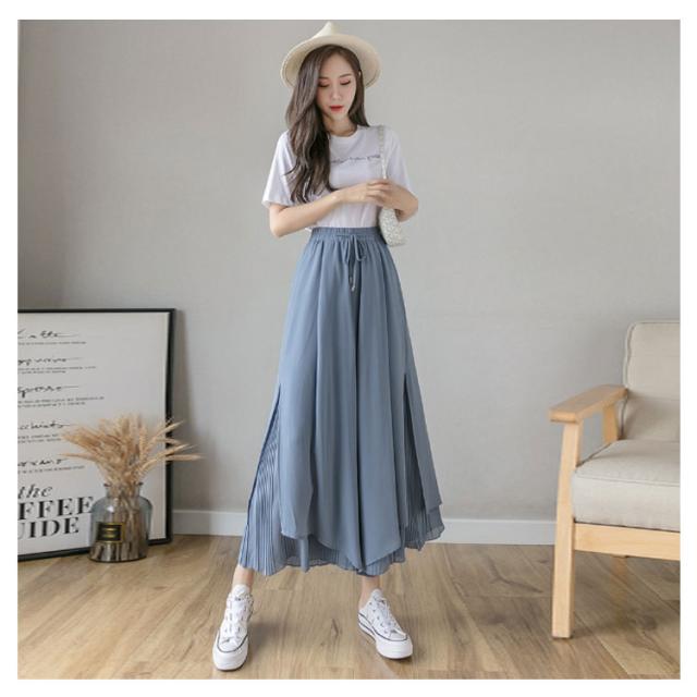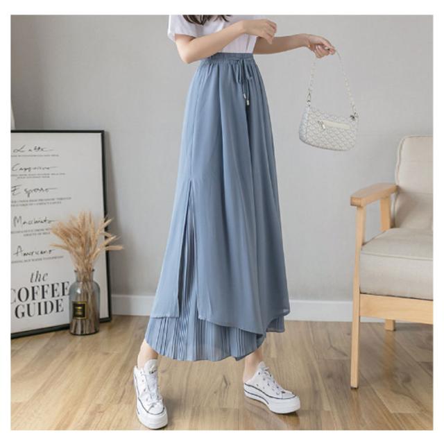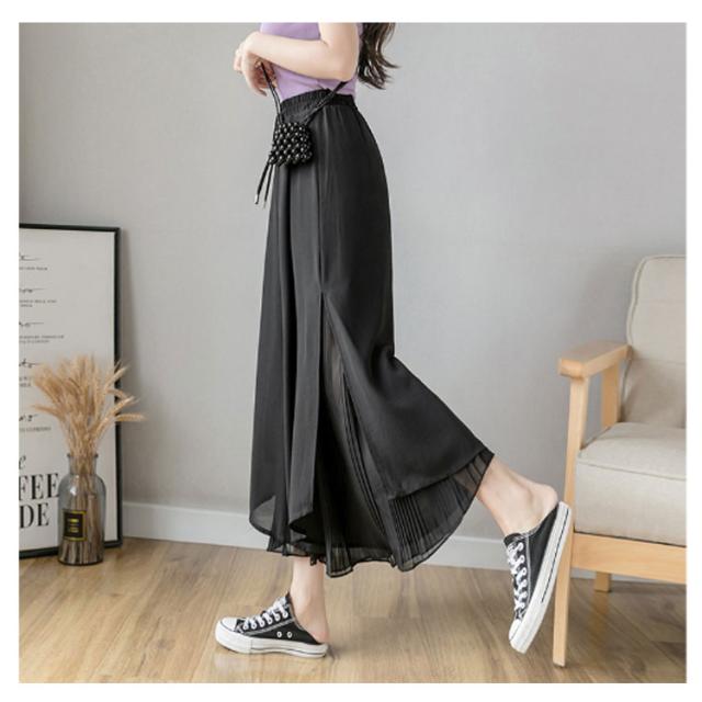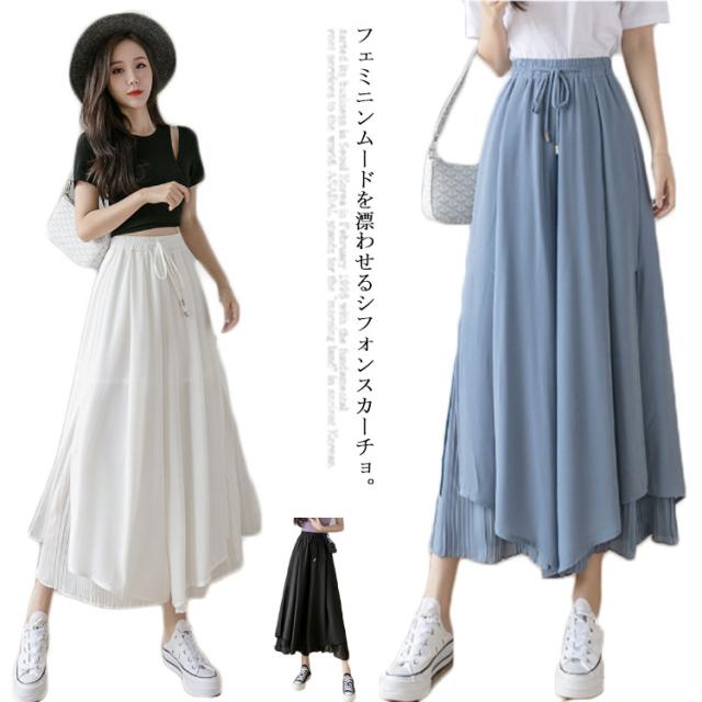 【送料無料】シフォンワイドパンツ ガウチョパンツ スカンツ スカーチョ サイドスリット ウエストゴム グロッシープリーツ ロング丈 細く見える 細身 リブフレアパンツ レディース ゆったり 綺麗 体型カバー ふんわり 2枚重ね ボトムス