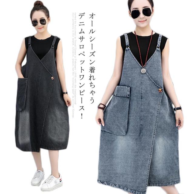デニムオールインワン デニムサロペット Vネック アシメトリー カジュアルワンピース オーバーサイズ サロペット ワンピース デニム 色落ち加工 大きめポケット 春夏 体型カバー 送料無料