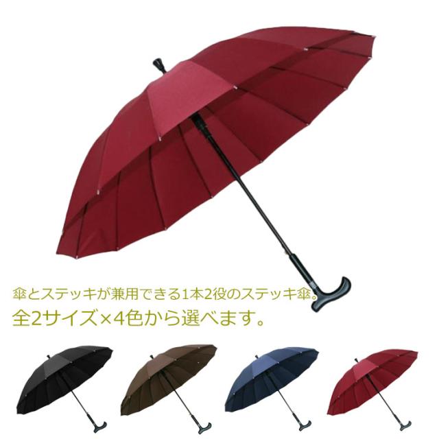 | 傘とステッキが兼用できる1本2役のステッキ傘。 傘にもなる、杖にもなるスマートなデザイン、散歩や旅行、お出かけ、登山など時の荷物が少なくて済むから嬉しい。 ワンタッチで簡単に開くことができるから、とても便利。 頑丈な16本骨、強風の日も安心の作り♪ 煩わしい雨も気にすることなく、これまで以上に楽しくお出かけに◎ 敬老の日、父の日、母の日などのプレゼントにも喜ばれます。 全2サイズ×4色から選べます。 | |
