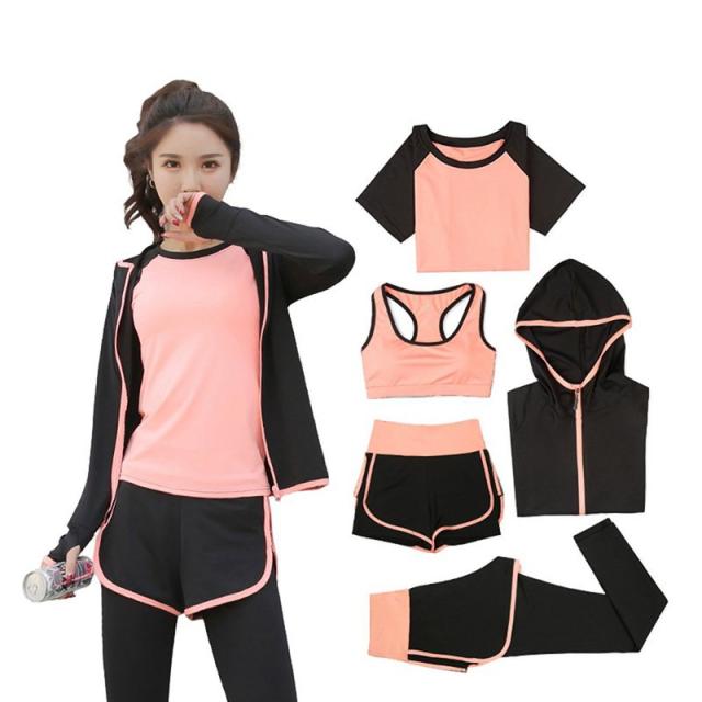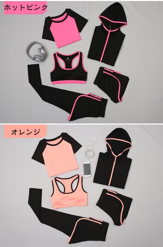トレーニングウェア レディース ヨガウェア ランニングウェア 上下セット スポーツブラ パンツ 半袖 ロングタイツ パーカー 5点セット ジム 吸汗 速乾 通気