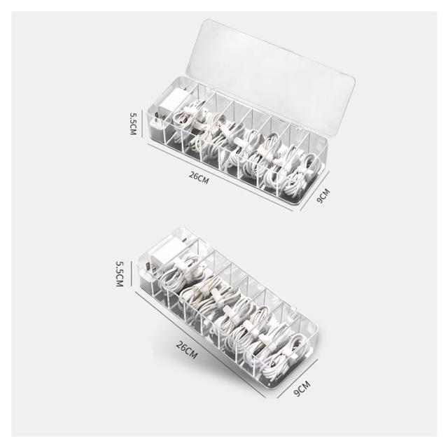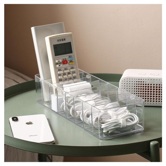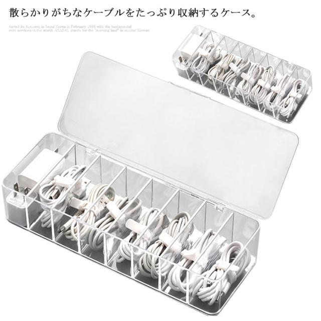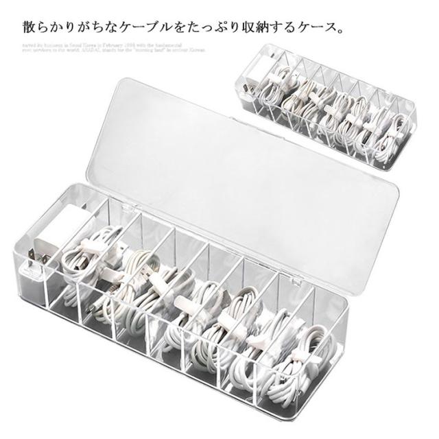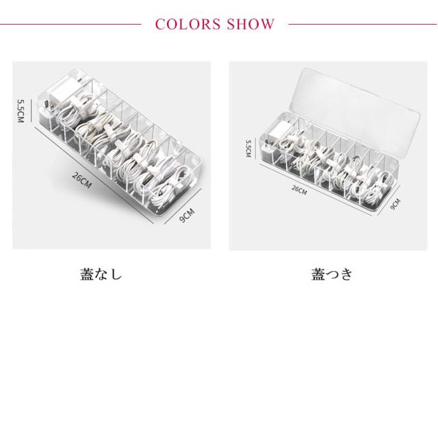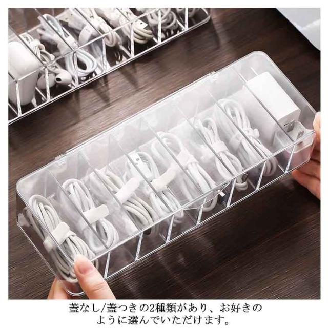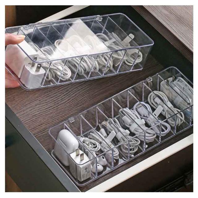 | 散らかりがちなケーブルをたっぷり収納するケース。 透明な仕様なので、入れ物は一目瞭然! 蓋なし/蓋つきの2種類があり、お好きのように選んでいただけます。 リモコン、スマホ、サングラスなども収納できます。 コスメなど様々な小物の整理、収納にもご使用頂けます。 | |