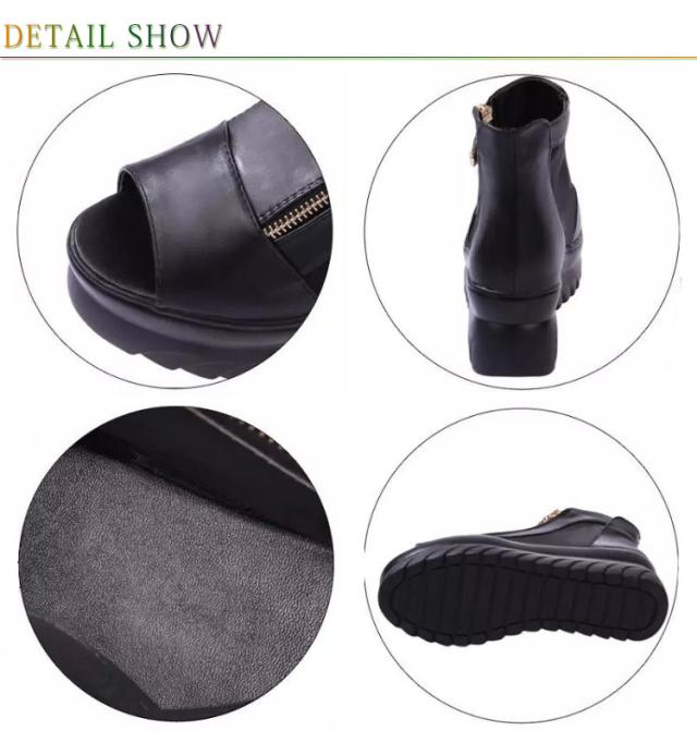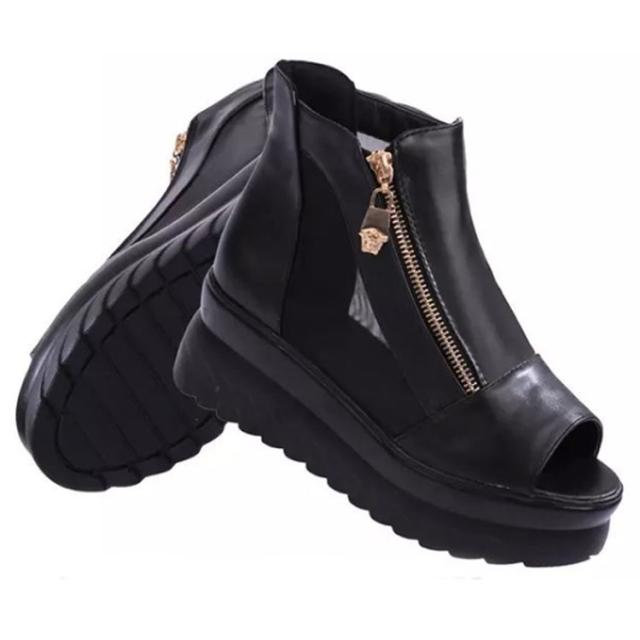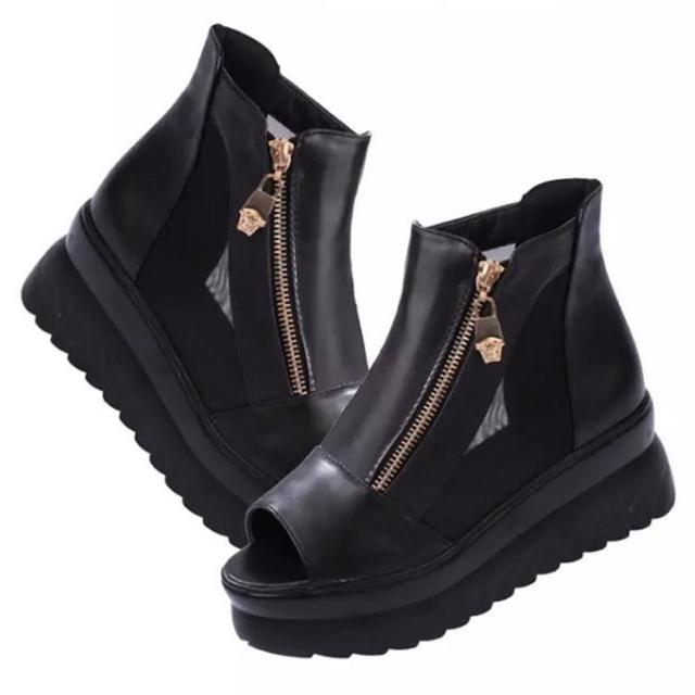 | いい感じの厚底でシースルー可愛いブーツサンダル。 抜け感たっぷりなシースルーデザイン、カジュアルにも合わせやすい。 夏でも暑苦しくなく、通勤着にも合わせやすい。 ファスナータイプですので、脱げる心配がなく歩きやすい。 オープントゥなのでサイズ感も気になりません。 柔らかいクッションも入っているので足の負担を軽減します。 | |