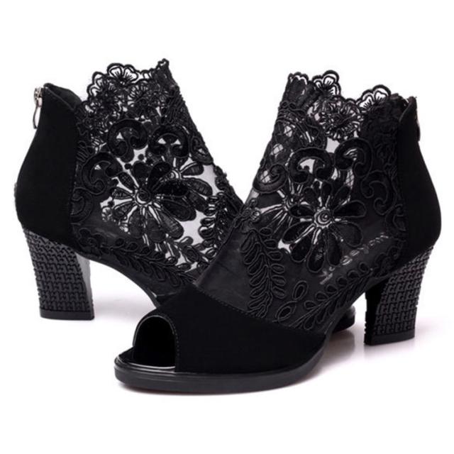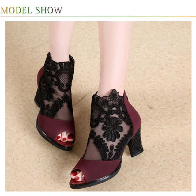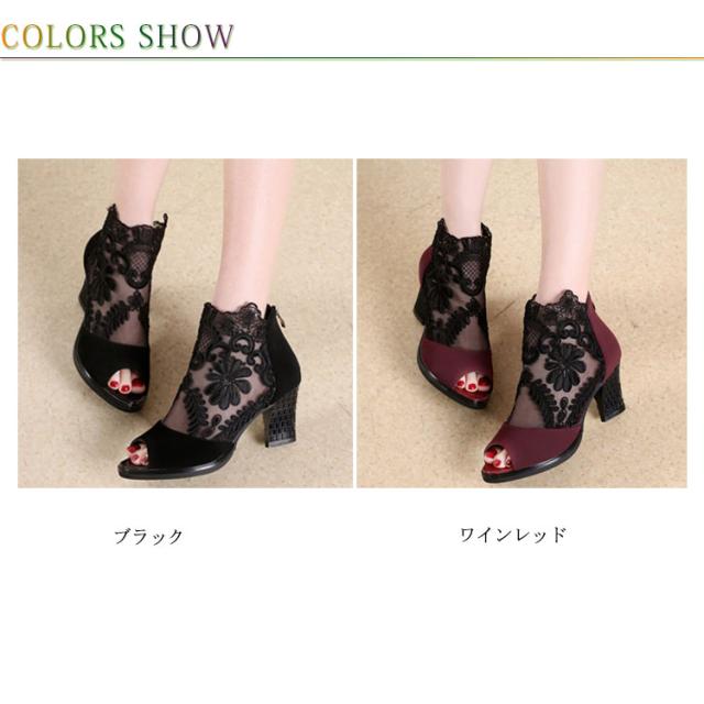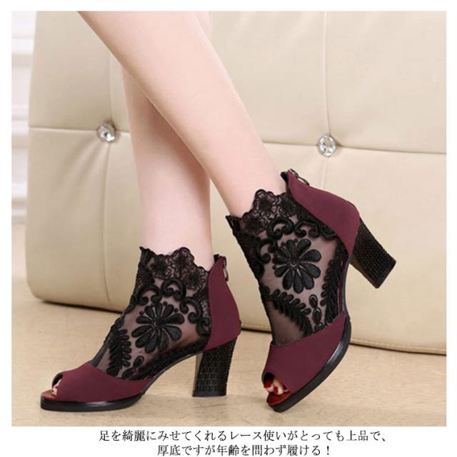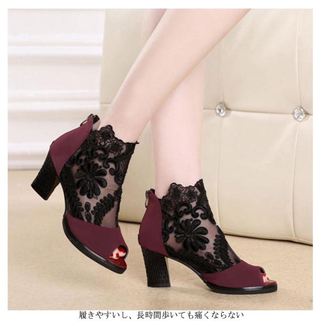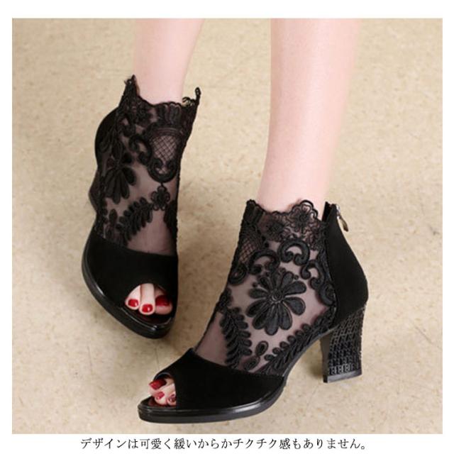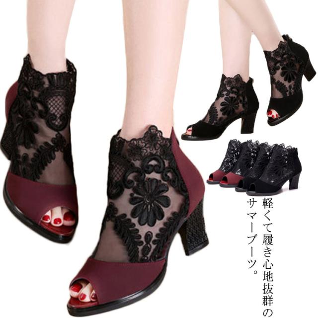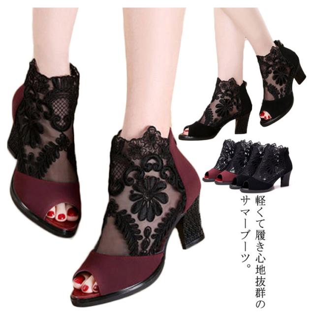 サマーブーツ レディース ブーツサンダル 春ブーツ 夏ブーツ メッシュレース 美脚サンダル ハイヒール 靴 ブーツ シースルー 透かし フラワーレース 花柄 切り替え オープントゥ サンダルブーツ レディースシューズ
