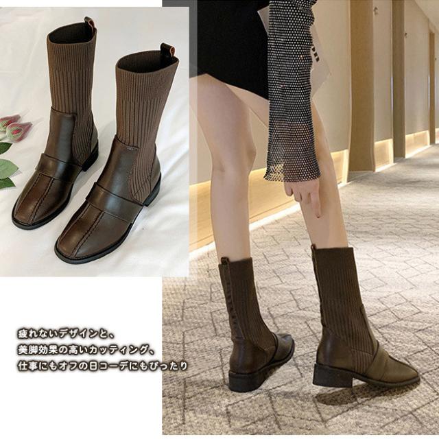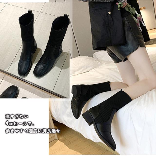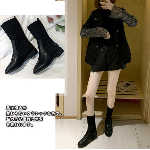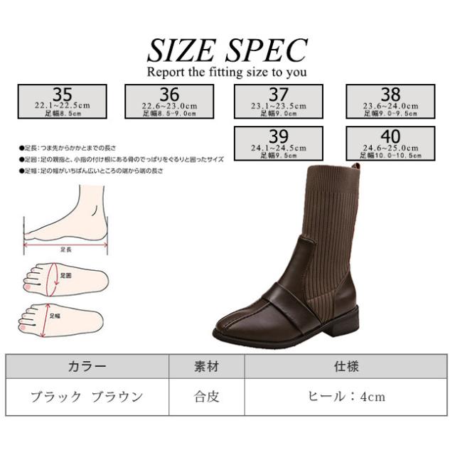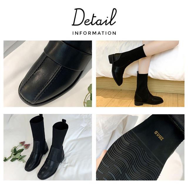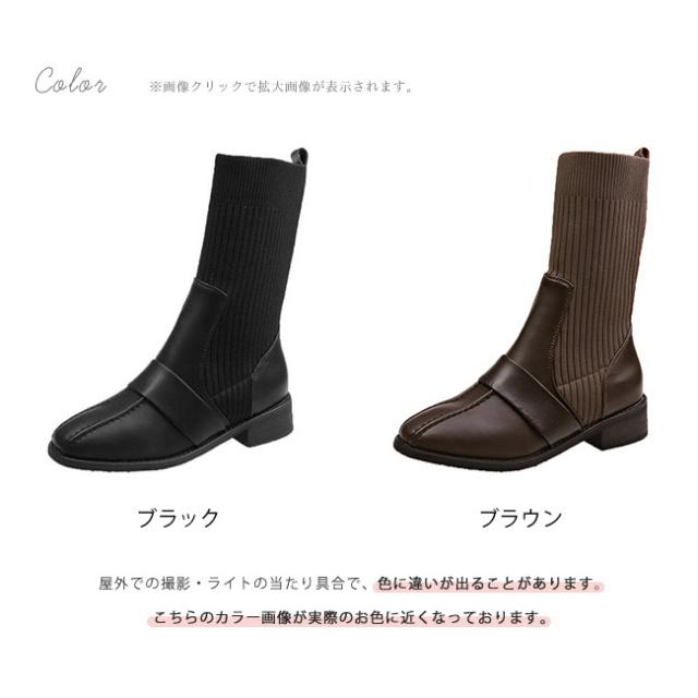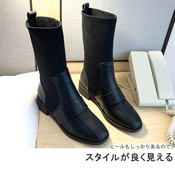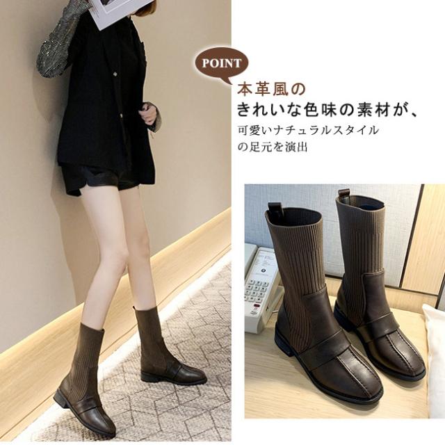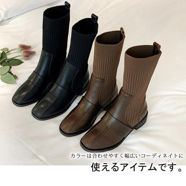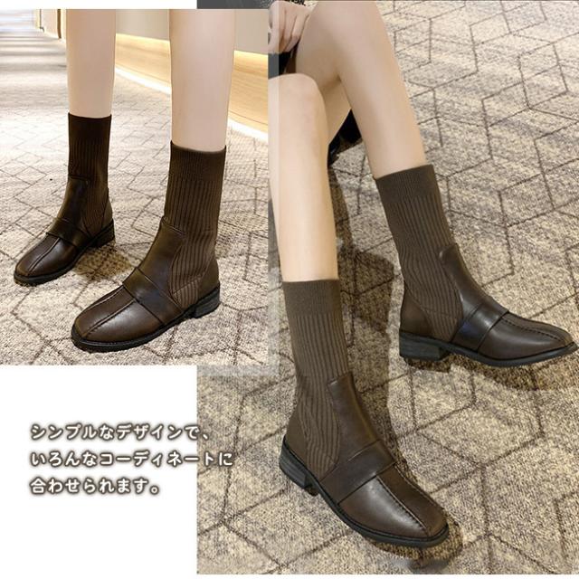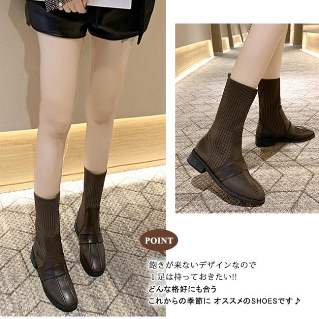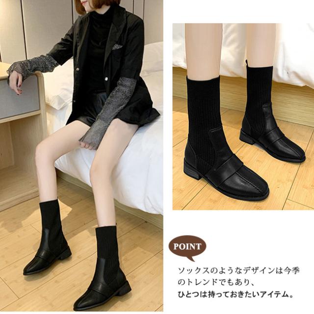 ソックスブーツ リブニットブーツ ニットブーツ ローヒール ショートブーツ レディース 黒 ストレッチブーツ スクエアトゥ PU 美脚 カジュアル 大きいサイズ