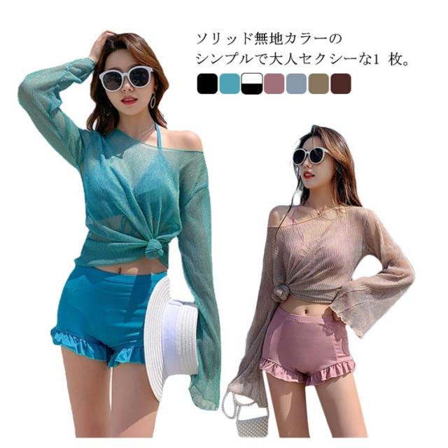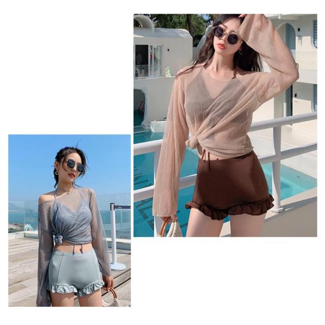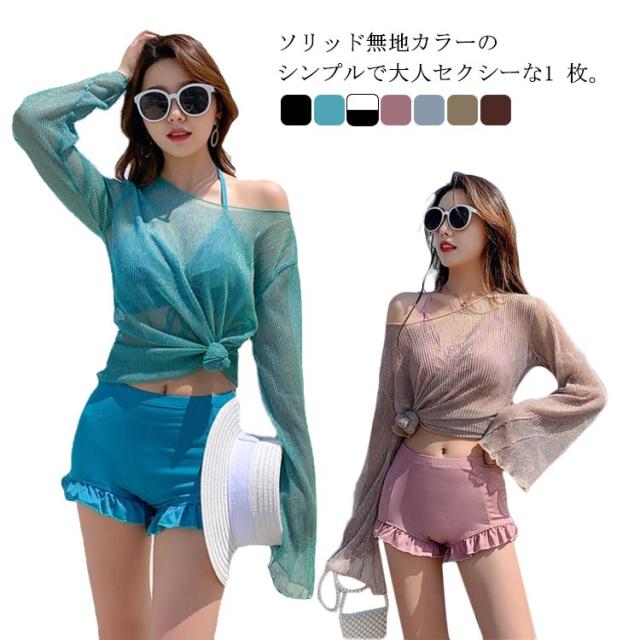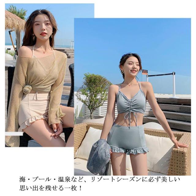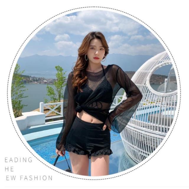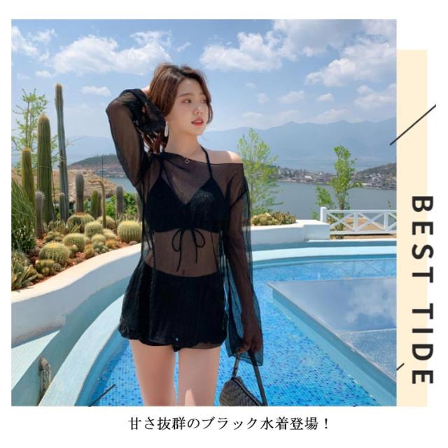 水着 3点セット レディース 体型カバー 上下セット セパレート パッド付き 袖付き 無地 ブラック ホワイト 夏 プール 海 水遊び 韓国風 大人 きれいめ 女性用