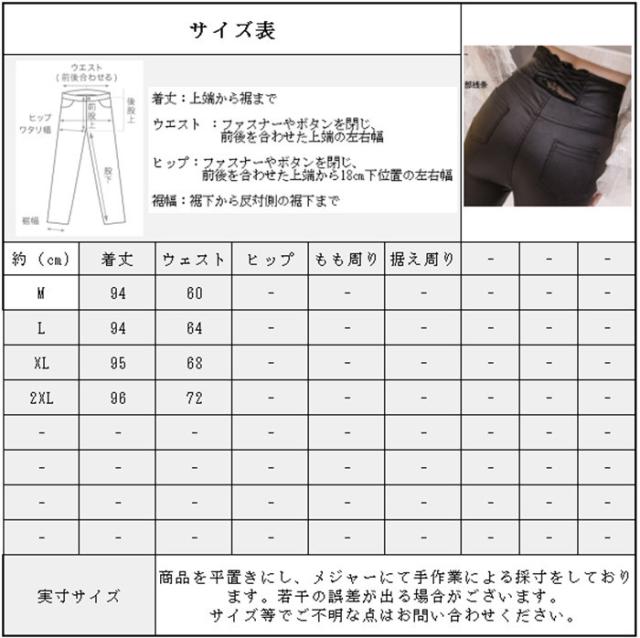 | サイズについての説明 | Mウェスト60 ズボン着丈94 Lウェスト64 ズボン着丈94 XLウェスト68 ズボン着丈95 2XL ウェスト72 ズボン着丈96 |