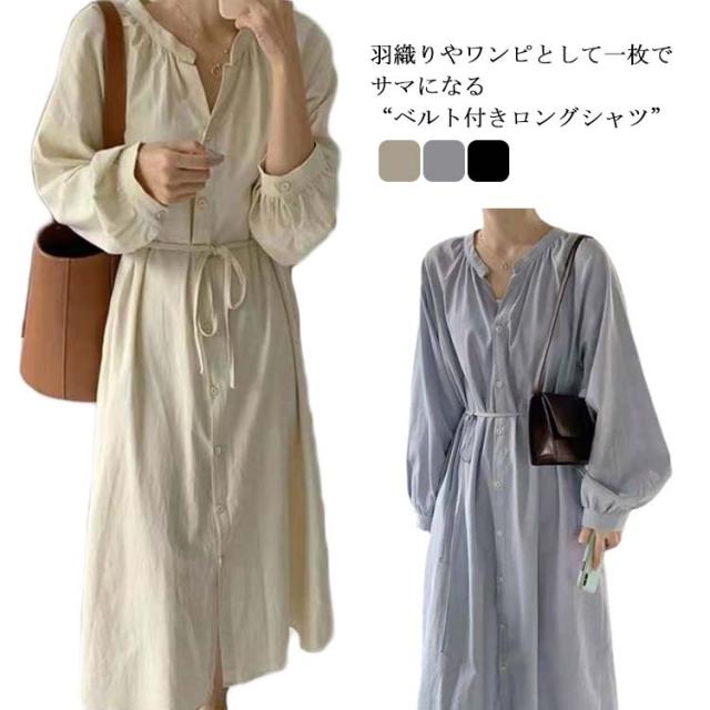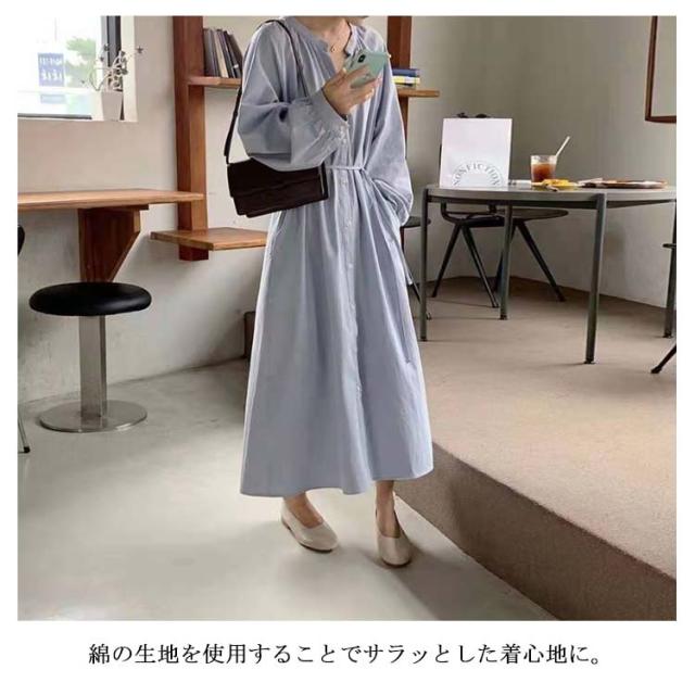 ワンピース レディース シャツワンピース 秋 長袖 Vネック ロングワンピース 韓国風【送料無料】春 夏 秋 ミモレ丈 ロング丈 マキシ丈 無地 リボン付き Aライン ゆったり 綿 コットン 通勤