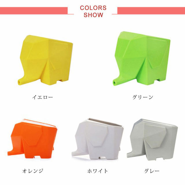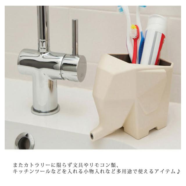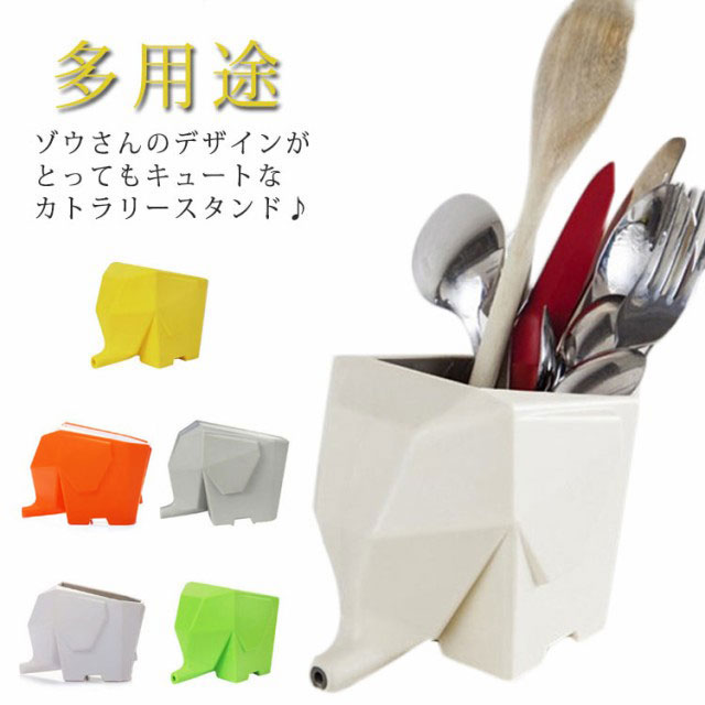 | ゾウさんのデザインがとってもキュートなカトラリースタンド♪ 鼻の部分は排水管になっているので水切りボックスとしてもお使い頂けます。 またカトラリーに限らず文具やリモコン類、キッチンツールなどを入れる小物入れなど多用途で使えるアイテム♪ カラーは豊富な5色展開♪ 可愛いデザインでお部屋のインテリアとしてもオススメです♪♪ キッチンでフォークやお箸などのカトラリーや洗面所でハブラシなどを収納すると、水切りが出来るので便利! | |