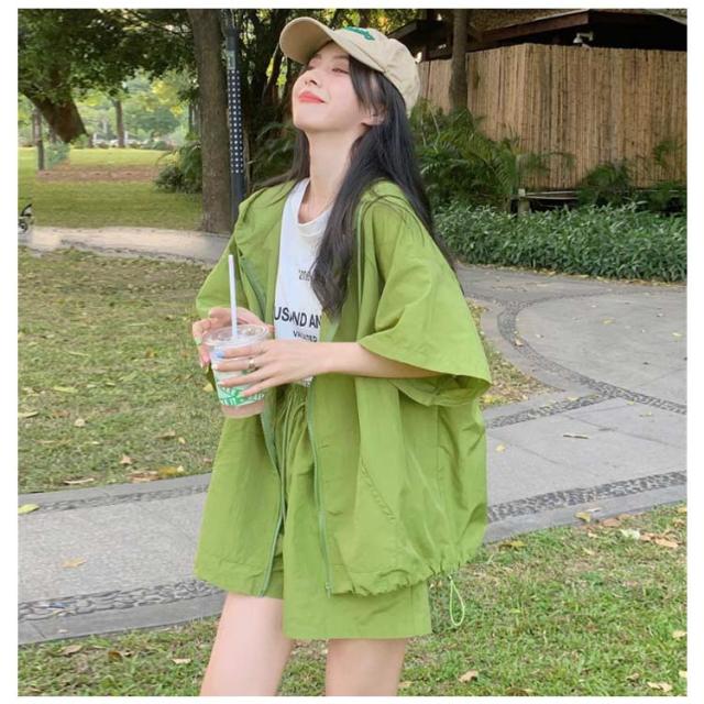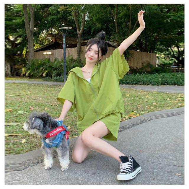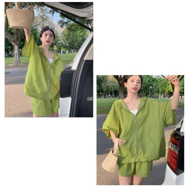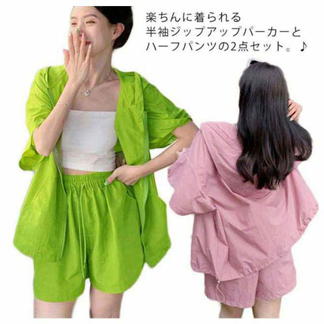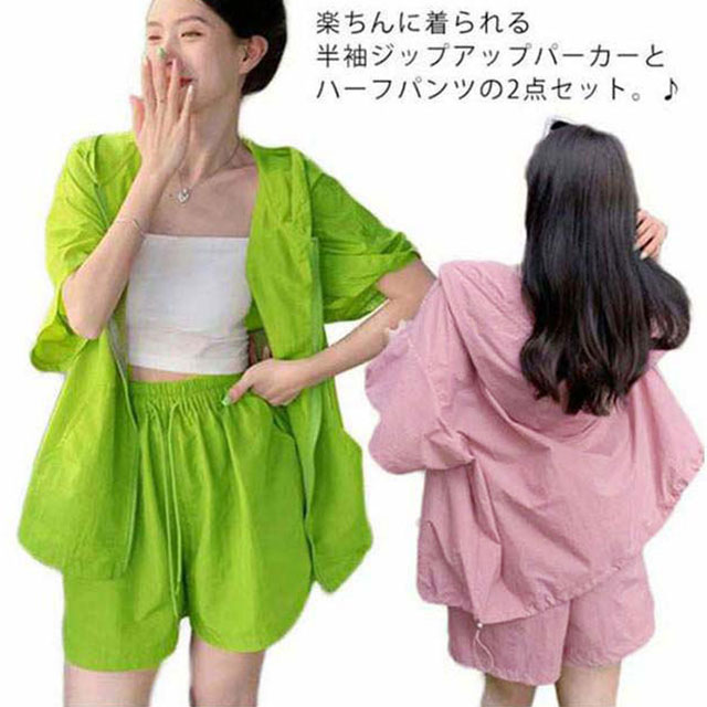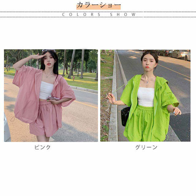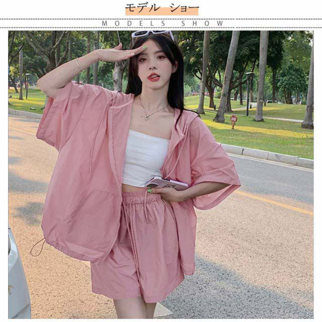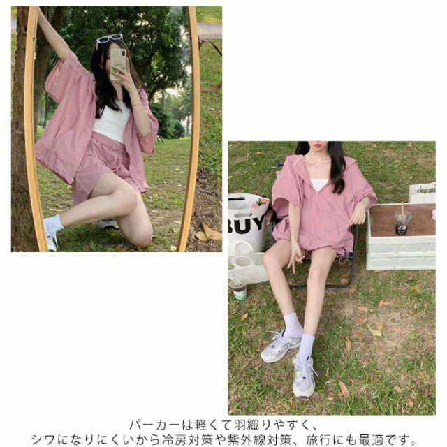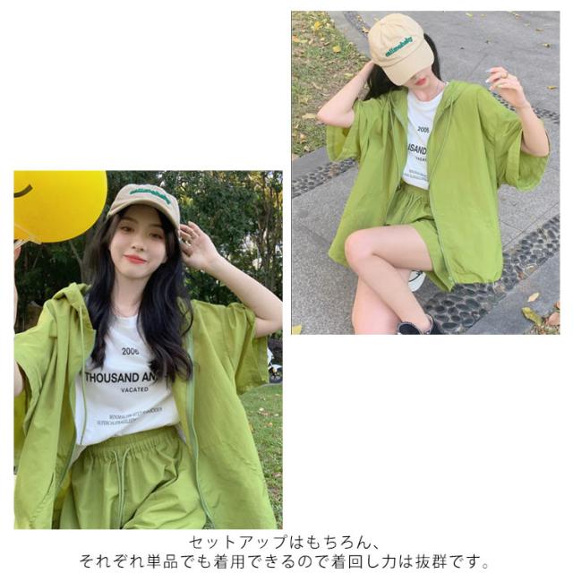 パーカー ハーフパンツ 半袖パーカー 上下セット 旅行 ジップアップ UVカットパーカー ゆったり 冷房対策 紫外線対策 カジュアル アウター ショートパンツ 薄手 セットアップ おしゃれ かわいい 無地 羽織 ビックシルエット 軽い 春 夏 お出かけ セット