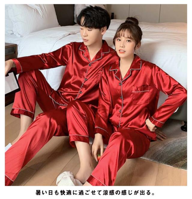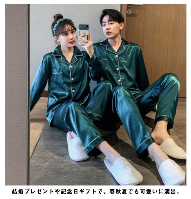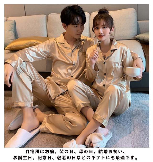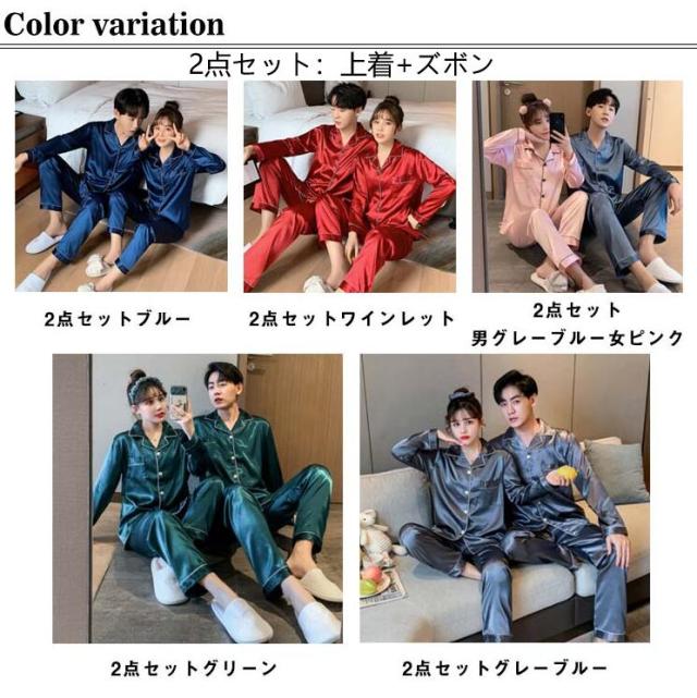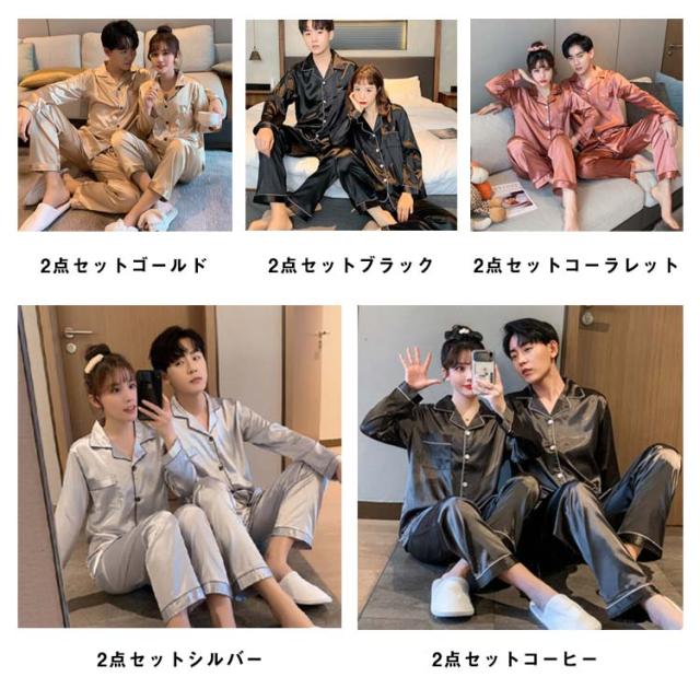 長袖 カップルペアルック 2点セット パジャマペアルックお揃い 点パジャマ 春 秋 ルームウェア シルクタッチ 涼感 皺にくい シンプル 無地 春