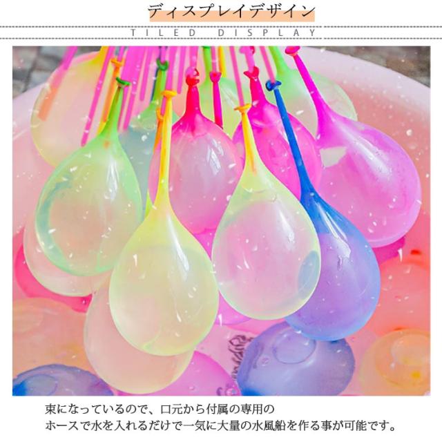| 全1110個!夏の遊びにぴったりな水風船。 束になっているので、口元から付属の専用のホースで水を入れるだけで一気に大量の水風船を作る事が可能です。 水を入れるだけで重さで結び口が自動的に締まるので、わざわざ手で結ばないで作れます。 運動会や文化祭など、飾り付けで水風船が多く必要な時に便利。 | |
