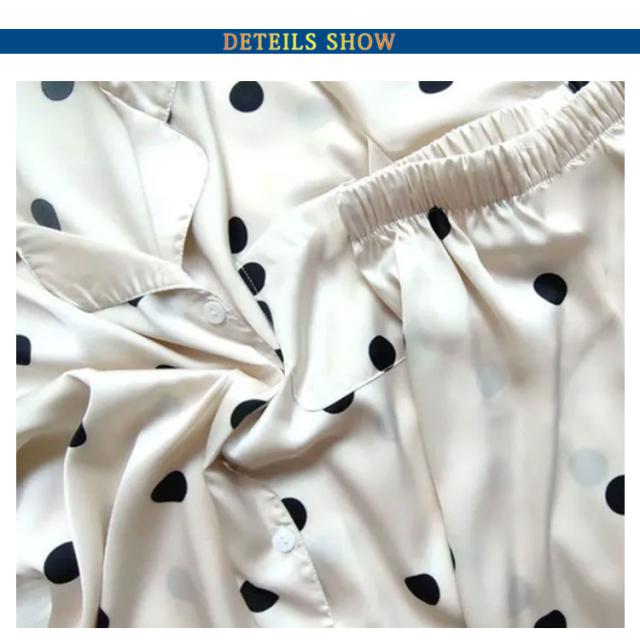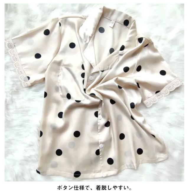 | しなやかな風合いが人気のナイトウェア。 大人気なドット柄と裾のレースがポイント。 サラッとしたシルクのような優しい肌触り。 ボタン仕様で、着脱しやすい。 | |
