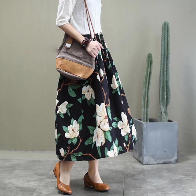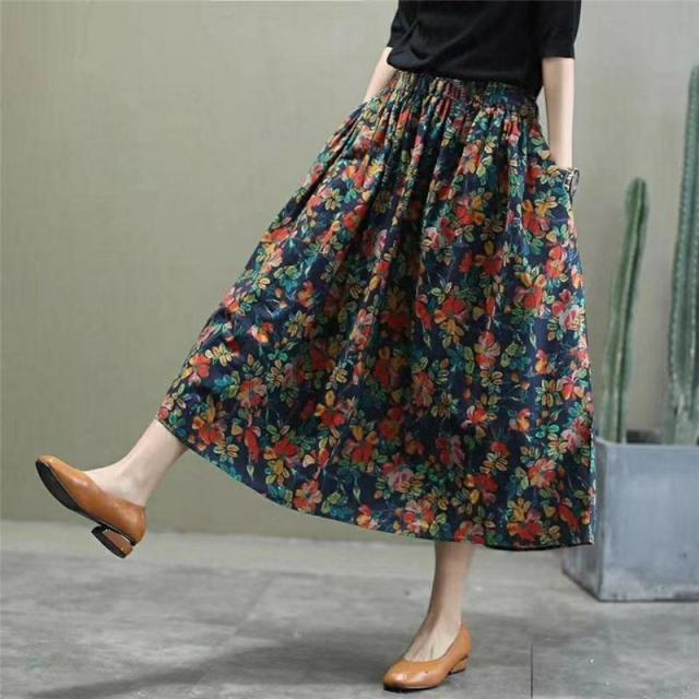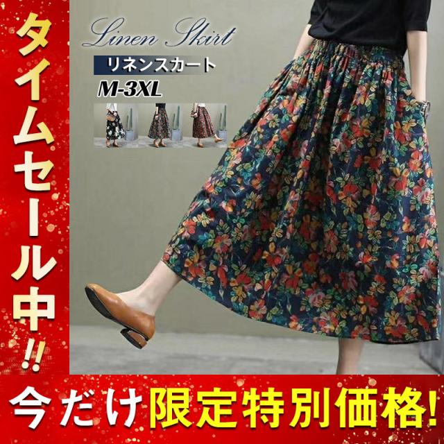スカート リネンスカート レディース フレア ロング丈 花柄 Aライン ハイウエスト ヴィンテージ 着痩せ ウエストゴム エスニッ