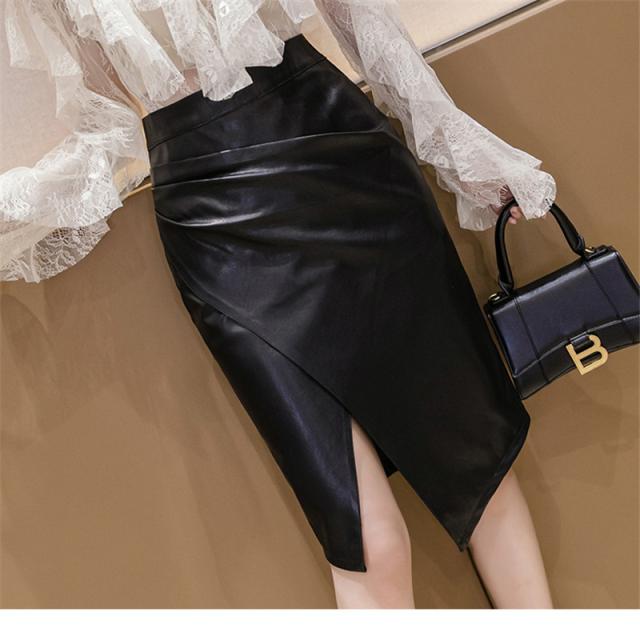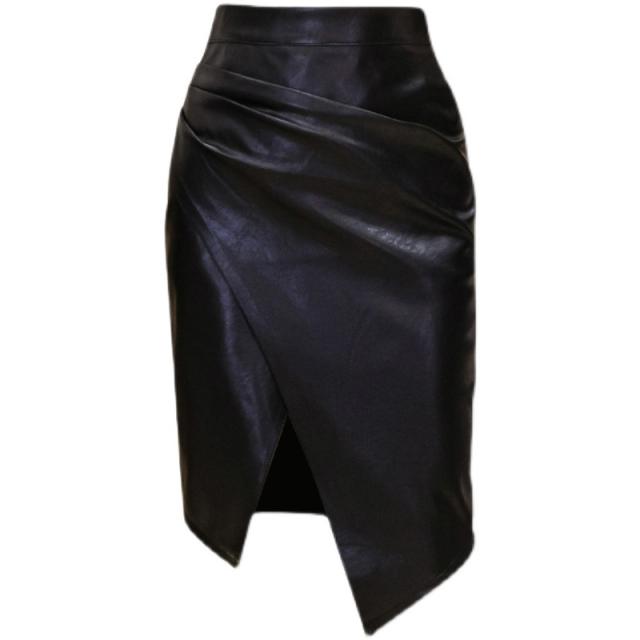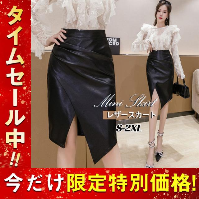 レザースカート レディース ミニ丈 タイト ショート丈 ハイウエスト スリット 膝丈 着痩せ シワ加工 フェイクレザー 無地 通勤