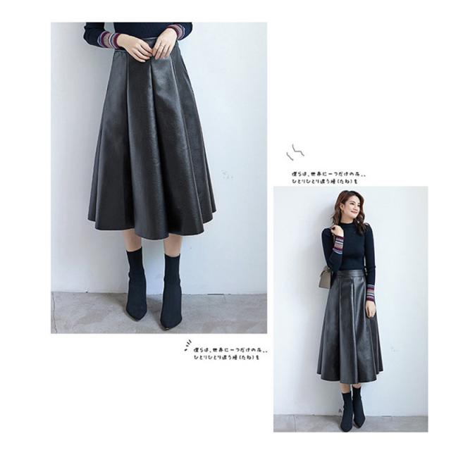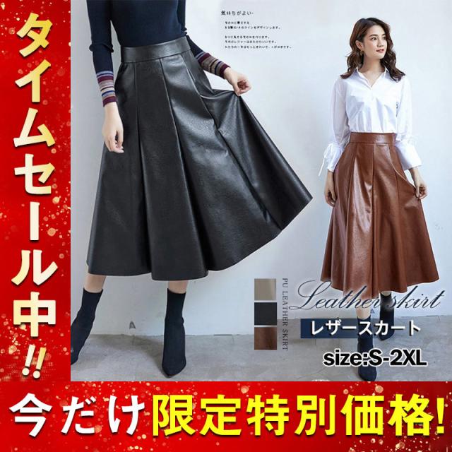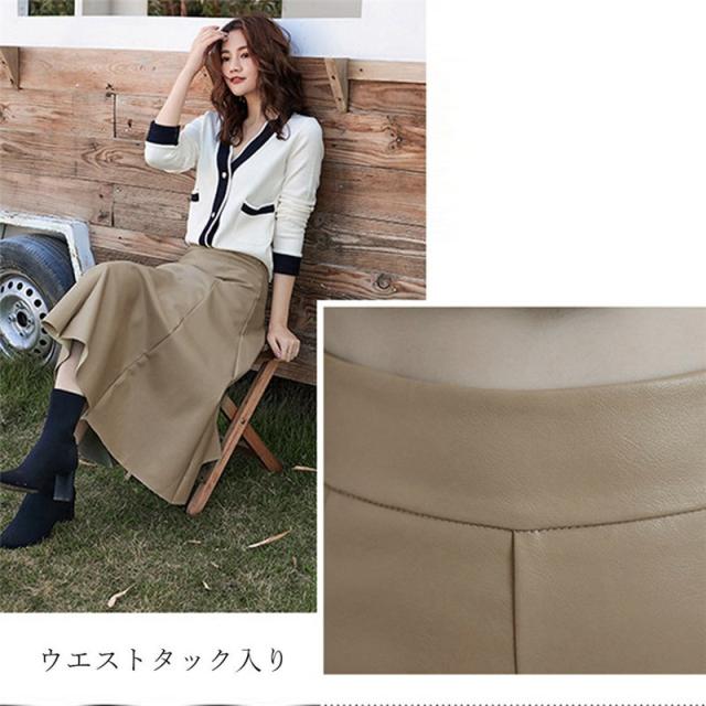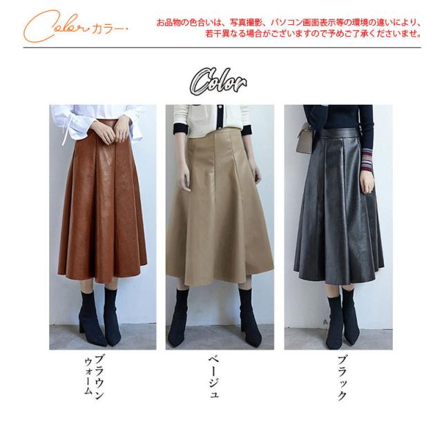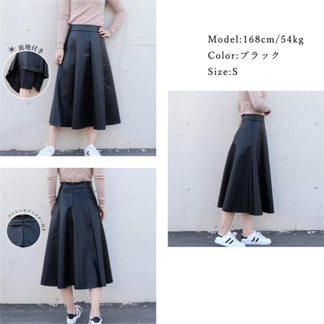 レザースカート ロングスカート レディース フレアスカート 革スカート ハイウエスト Aライン フェイクレザー ミディアム丈 着痩