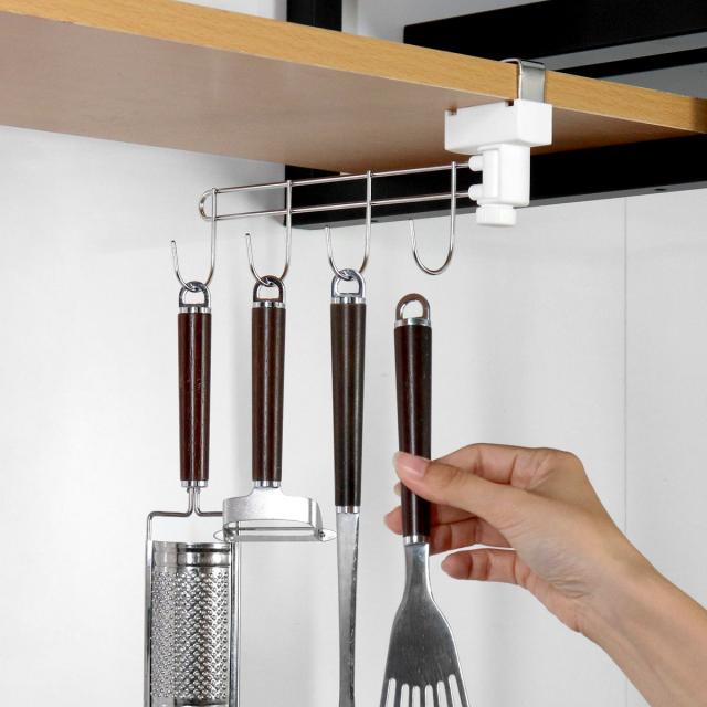 金具部分を付け替えると、前後どちら向きにでも取り付けることができます。向きを変えることで、フック部分を吊戸棚よりも手前に回転させることができ、より収納しているものが手に取りやすくなります。