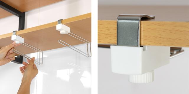 吊戸棚の底板にはさんでネジを閉めるだけの簡単設置です。女性でも楽にしめられる、回しやすい形のネジだけで簡単に取り付けできます。しっかり固定することができるので、ずれ落ちる心配はありません。底板の厚さ約1.5cm〜2.5cmに対応しています。