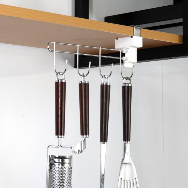 吊戸棚の下にキッチン小物が収納できる「吊戸棚下はさみ小物シリーズ」です。どうしてもデッドスペースになってしまう吊戸棚下を有効活用することで、キッチン小物をすっきりと収納することができます。新たな収納スペースを作ることで、調理スペースなどが増え、料理が楽しくなります。無理に引出しなどに入れることなく、見せる収納ができるので、サッと使えて時短にもなります。
